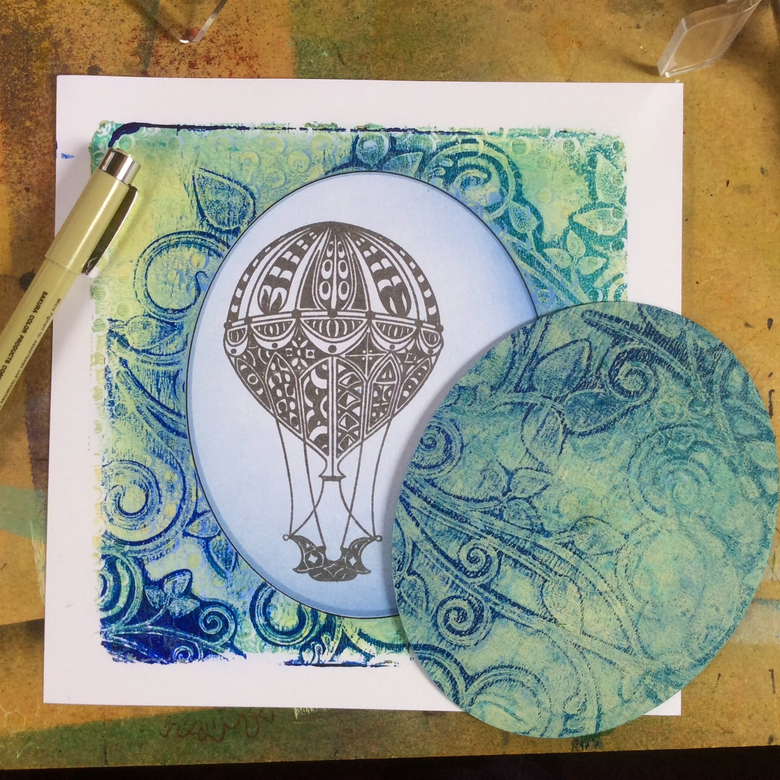 Always happy when this happens, too. Still got a bit of the pattern on the Gelli Plate? Let it dry, and we’ll come back to it….