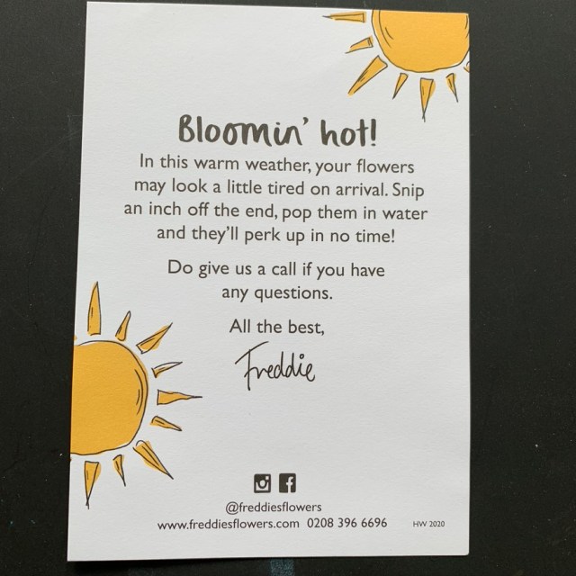 We saw Freddie’s ad on TV this afternoon and I have a feeling he is considering trying the service as it is going to be a long time before he can go out to buy a bouquet. I will show him your blog and hope he takes your recommendation on board even if it is not until our anniversary in October. I live in hopes.