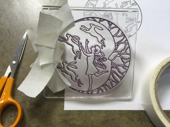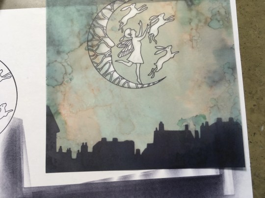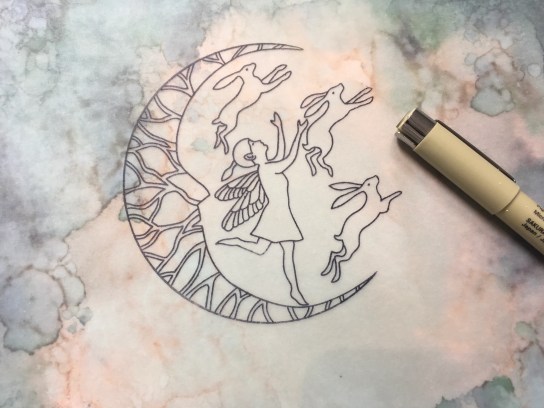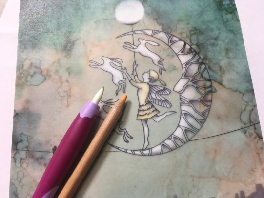 Flip over to the back and erase colour from the hares and fairy. Also add highlights in the moon using the eraser, and even add a full moon above.
