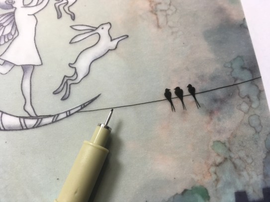 Time to add a flash of interest to her little dress. Add detail with a Micron pen, and colour with a perga Liner pencil. Up to you whether you work from the back of the front. I used the blending nib to smooth out the colour with no additive whatsoever. Perfect. Oh ! And draw a line to the balloon moon, too….