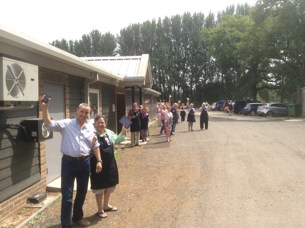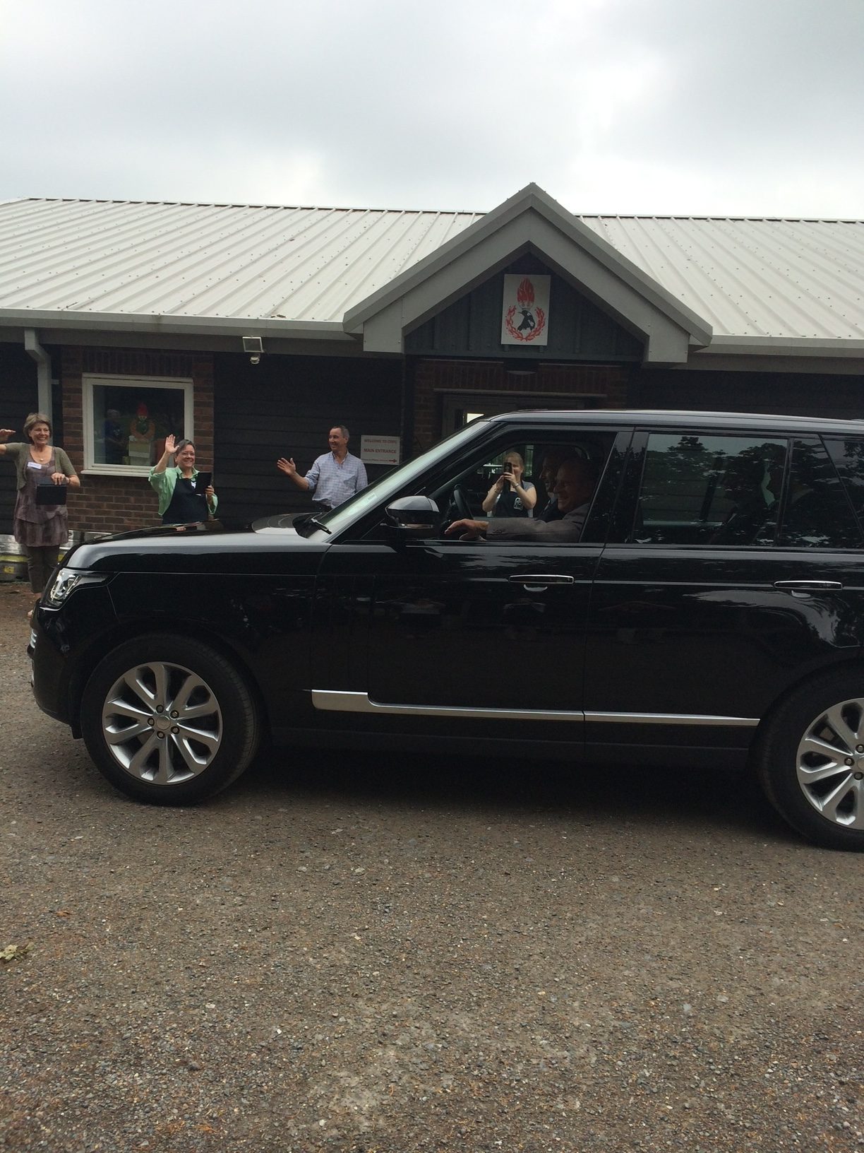 The next we were out in the sunshine, waving and clapping, cheering and whooping – and welcoming the Prince. Texas Debby and Dave at the front here!