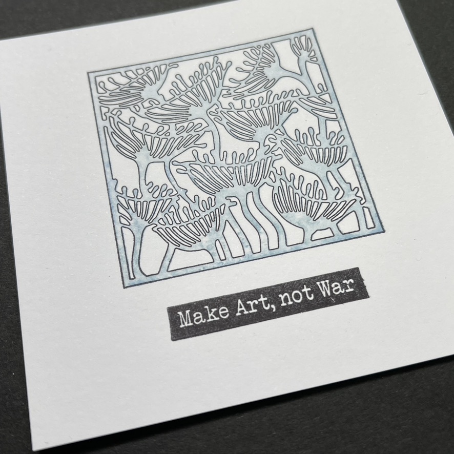 - Stamp the outline stamp first, using black Archival on white stencil card. We sell the card already chopped up into quartered for you. EASY! HERE. I stamped the little outline stamp up a little on the card, to leave room for the Make Art Not War sentiment.