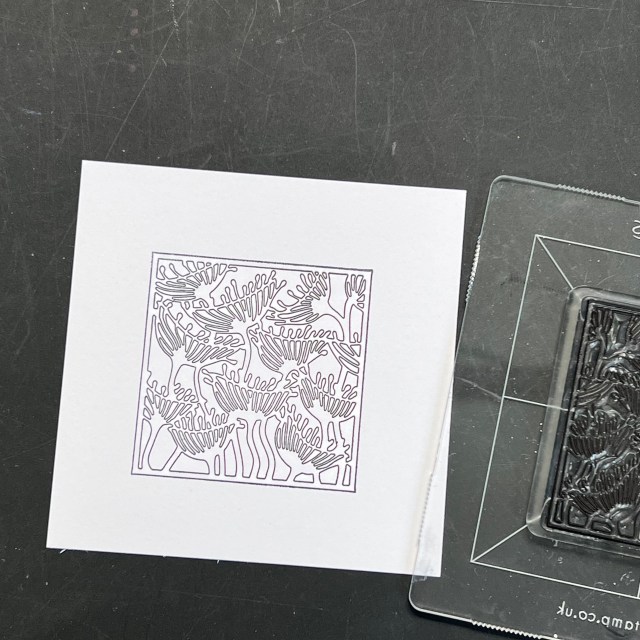 Now ink up the other stamp in a coloured ink pad. I used a blue pad. Maybe Feathered Peacock or Broken China. Either way, a die based ink pad. Stamp it onto another piece of the same card, so you can see how lovely the second stamp is too. Sits beautifully on its own too.