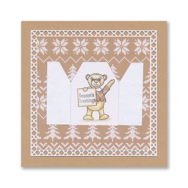 I actually showed off a little demo by Linda Spencer yesterday on Clarity TV. She paired one of the paper designs with our newest friend, BIP the Bear, peeping through one of our Advent Windows…so cool!