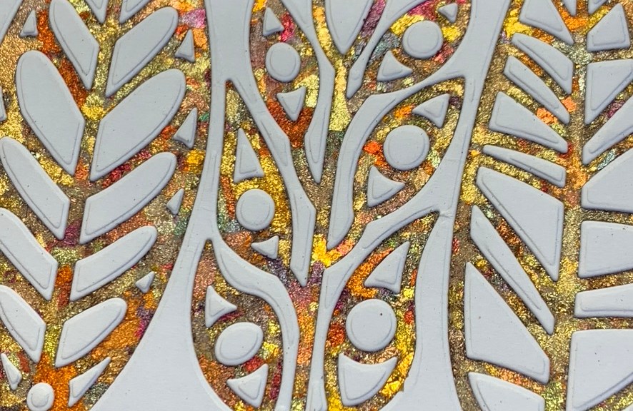 Hi there. Haven’t played with a die for a while. Found this trap-the-scrap piece from one of our Fresh Cut Funky Foliage Leave & Trees Dies, and decided to turn it into a card for someone special. She likes a little bling, so here goes…. Trap the white card scrap from the die on a double-sided adhesive sheet. Then simply cover it in Gilding flakes. We sell lots of different colours – really nice! Use the yellow sponge to buff…